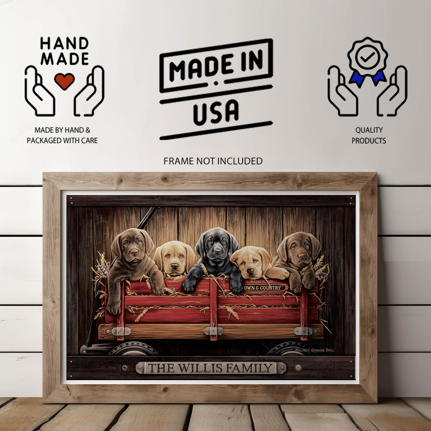 Add warmth and wagging tails to your space with this adorable personalized Labrador print! Featuring black, yellow, and chocolate Lab puppies riding in a classic red wagon, this artwork is full of rustic charm with a weathered barn wood-style background.